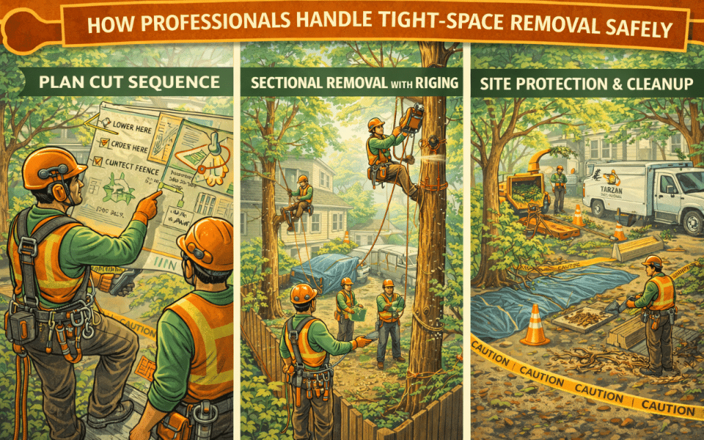 - Tight-space removal is all about control: sectional cuts, rigging, and safe lowering especially with “zero drop zone” yards.