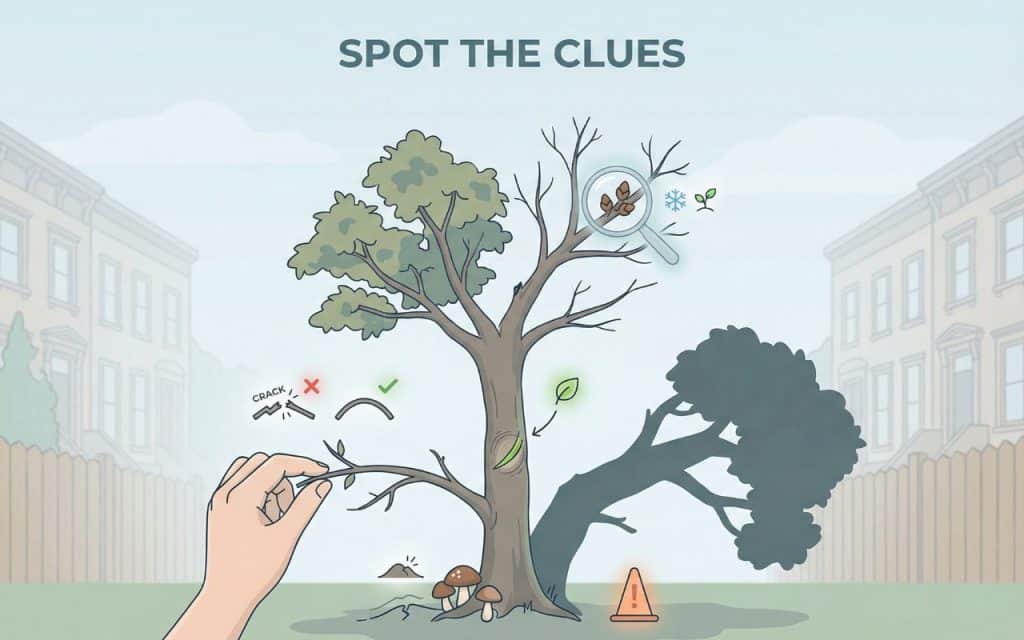 Note: This is a general homeowner guide. If the tree is leaning, dropping limbs, or near a roof/sidewalk, schedule a professional assessment.