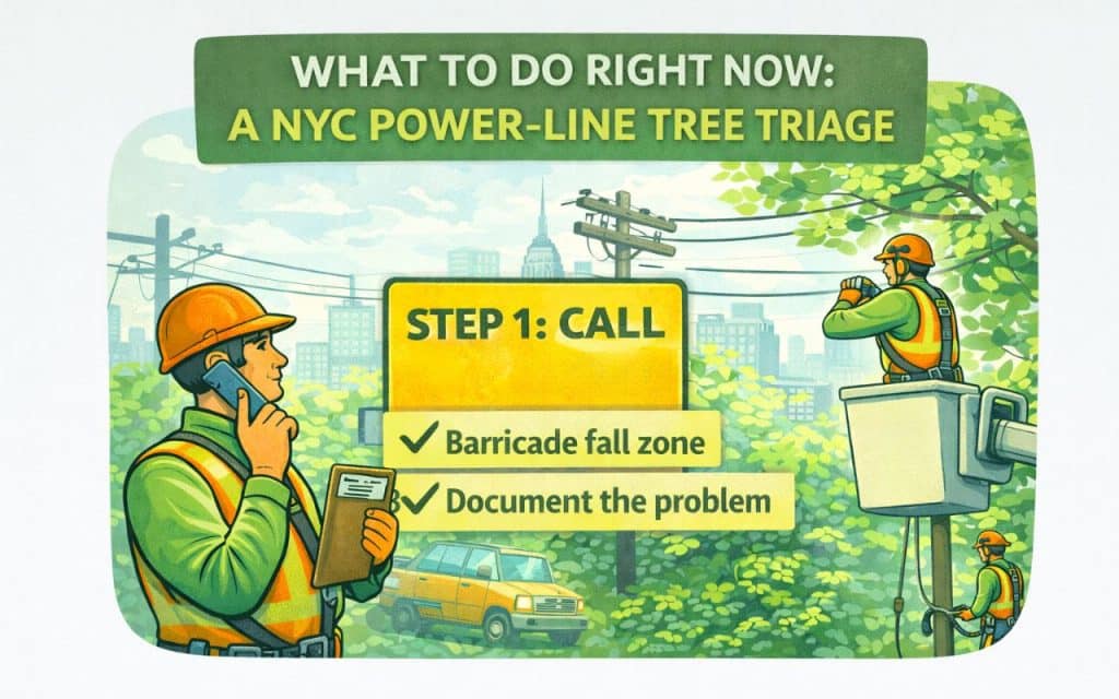 In NYC, the “right call” may include Con Edison involvement especially for entanglement or hazardous trees near overhead equipment. Con Edison publicly describes inspection/trimming programs and hazardous tree removal near power lines. Con Edison+1